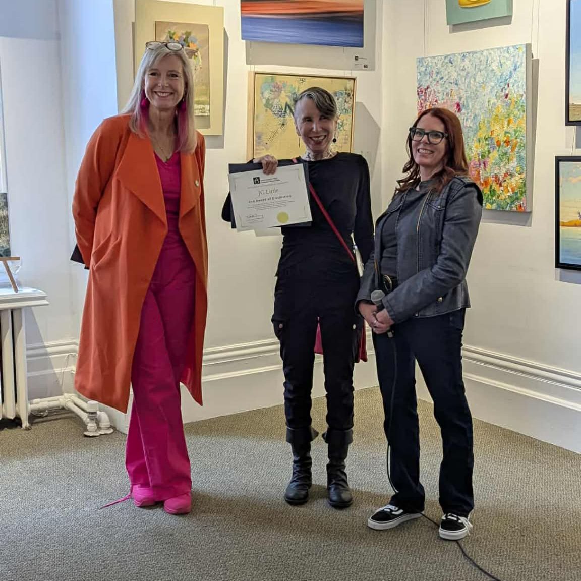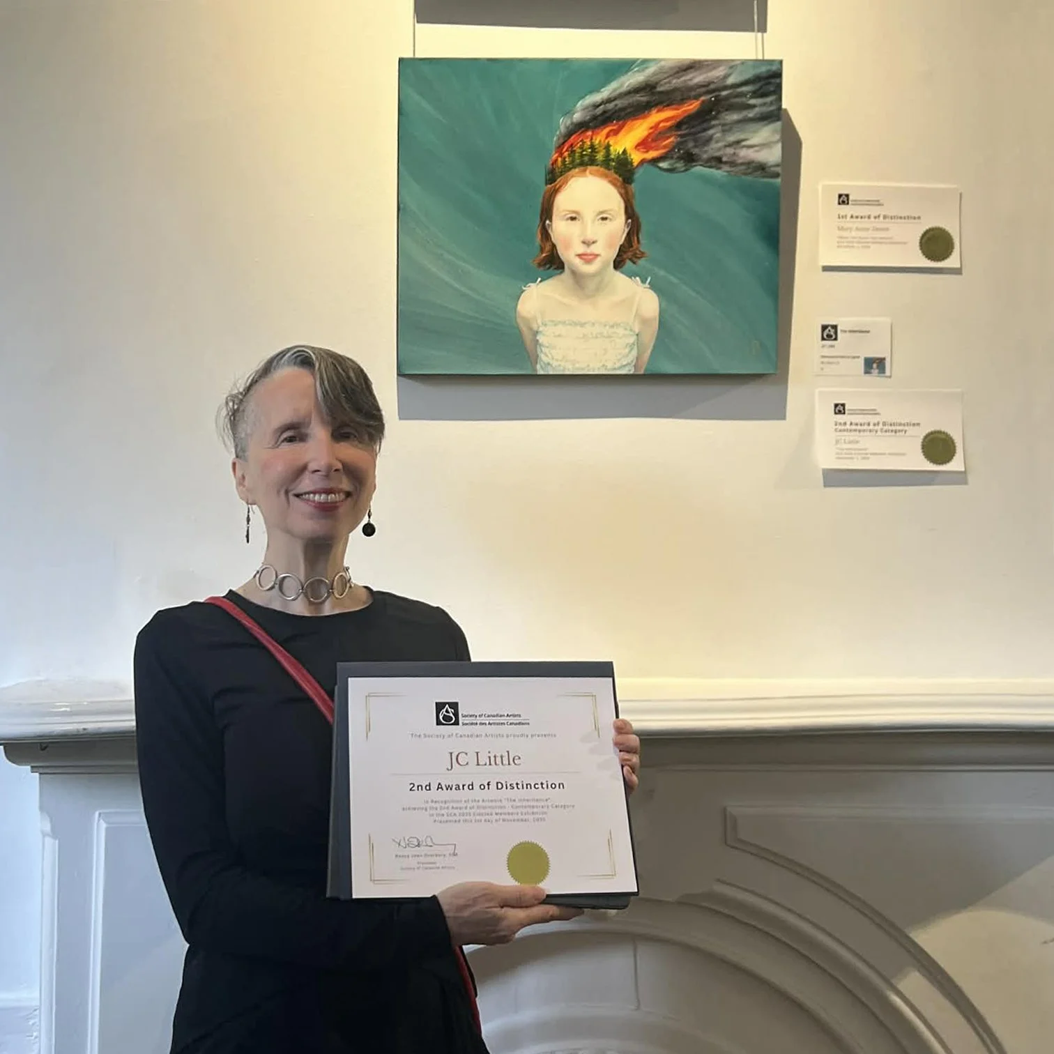 JC Little with the SCA 2nd Award of Distinction certificate for her painting, The Inheritance, at Dignam Gallery, Women’s Art Association in Toronto.